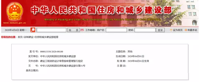 2019年5月10日,司法部法制信息網(wǎng)公開征求意見系統(tǒng),面向全社會公開征求《建設(shè)工程消防設(shè)計審查和驗收管理規(guī)定(征求意見稿)》意見。時隔半年后,標(biāo)題最終修改為《建設(shè)工程消防設(shè)計審查驗收管理暫行規(guī)定》(以下簡稱《規(guī)定》),并于2020年4月4日,已經(jīng)住房和城鄉(xiāng)建設(shè)部部務(wù)會議審議通過,以住房和城鄉(xiāng)建設(shè)部令第51號發(fā)布,并自2020年6月1日起施行。新規(guī)明確了履行消防設(shè)計審查驗收,備案抽查職責(zé)的同時,增加了優(yōu)化營商環(huán)境、工程建設(shè)項目審批制度改革等內(nèi)容。