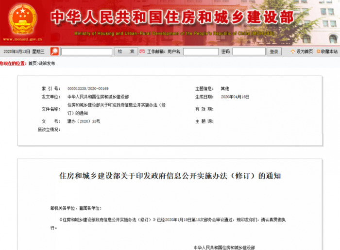 《實(shí)施辦法》要求,住房和城鄉(xiāng)建設(shè)部公開政府信息,采取主動(dòng)公開和依申請(qǐng)公開的方式。