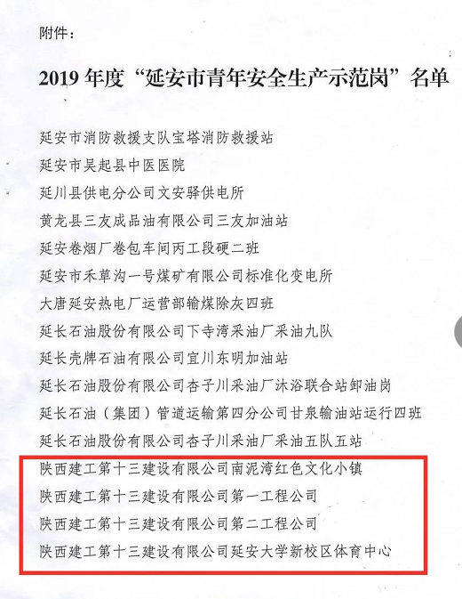 近日,共青團延安市委、延安市應急管理局、延安市青年聯(lián)合會聯(lián)合下發(fā)《關(guān)于命名表彰2019年度延安市青年安全生產(chǎn)示范崗的決定》,陜建十三建公司第一工程公司、第二工程公司、南泥灣紅色文化小鎮(zhèn)項目部、延安大學新校區(qū)體育中心項目部四個集體榮獲2019年度“延安市青年安全生產(chǎn)示范崗”榮譽稱號。