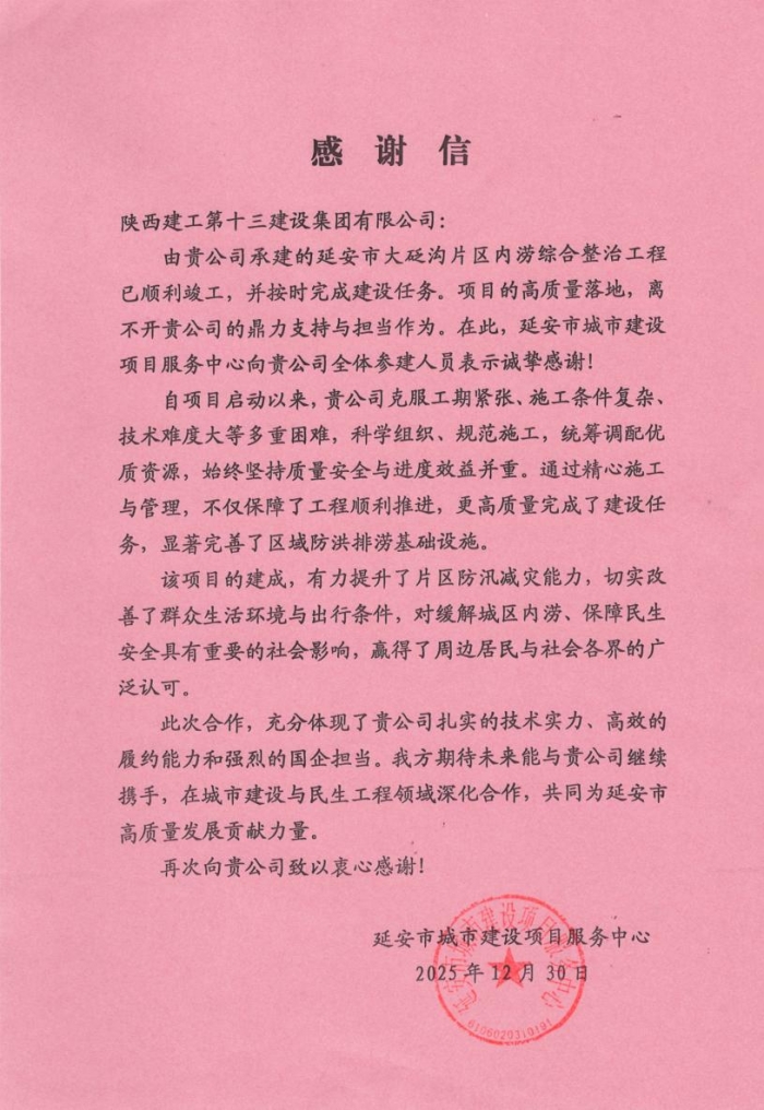 延安市城市建設(shè)項目服務(wù)中心向集團(tuán)致感謝信,充分肯定了集團(tuán)為延安市大砭溝內(nèi)澇綜合治理工程付出的艱辛努力與卓越貢獻(xiàn)。信中指出,自項目啟動以來,集團(tuán)在克服工期緊張,施工條件復(fù)雜,技術(shù)難度大等多重因素,科學(xué)組織、規(guī)范實施,統(tǒng)籌調(diào)配優(yōu)質(zhì)資源,高質(zhì)量完成建設(shè)任務(wù),顯著完善了區(qū)域防洪排澇基礎(chǔ)設(shè)施。充分彰顯了集團(tuán)扎實的技術(shù)實力,高效的履約能力和強(qiáng)烈的國企擔(dān)當(dāng),贏得了周邊居民和社會各界的廣泛認(rèn)可。