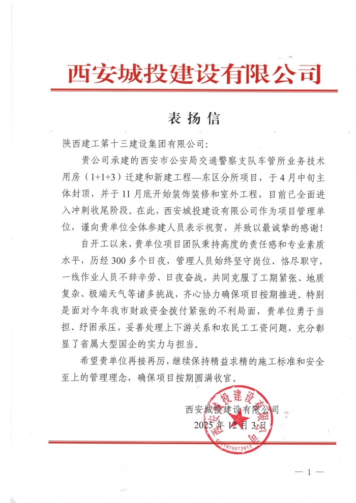 西安城投建設(shè)有限公司向集團(tuán)致表揚信,對集團(tuán)承建的西安市公安局交通警察支隊車管所業(yè)務(wù)技術(shù)用房(1+1+3)拆遷和新建工程─東區(qū)分所項目致以表揚。信中指出,項目歷經(jīng)300多個日夜,建設(shè)人員不辭辛勞、日夜奮戰(zhàn),克服工期緊張、地質(zhì)復(fù)雜、極端天氣等諸多挑戰(zhàn),齊心協(xié)力推進(jìn)項目順利實施。特別在面對資金緊張,集團(tuán)勇于擔(dān)當(dāng)、紓困承壓,積極協(xié)調(diào)各方關(guān)系,穩(wěn)妥處理農(nóng)民工工資問題,充分彰顯了國有企業(yè)的實力與擔(dān)當(dāng)。希望集團(tuán)能繼續(xù)保持精益求精的施工標(biāo)準(zhǔn)和安全生產(chǎn)保障,確保項目按期圓滿收官。