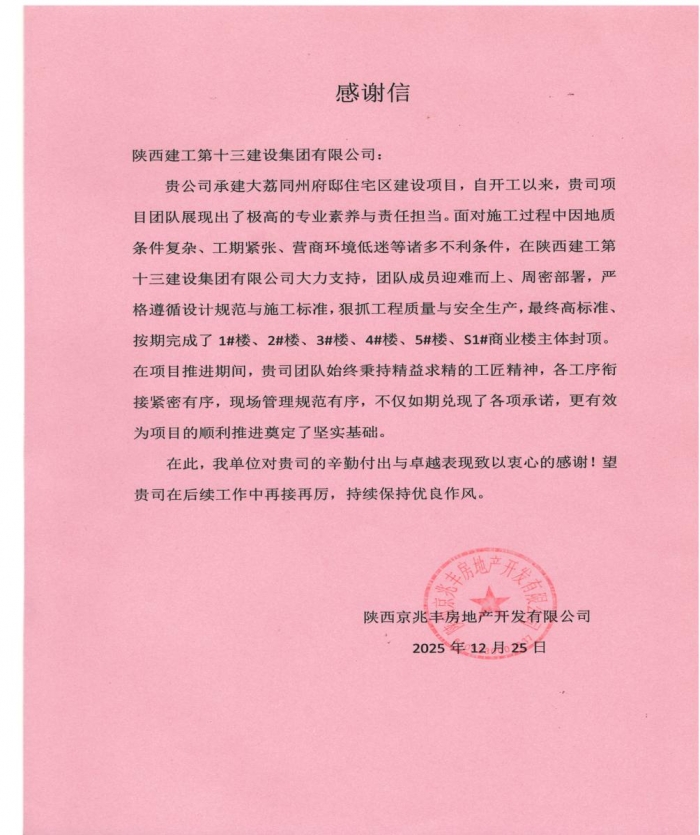 陜西京兆豐房地產(chǎn)開發(fā)有限公司向集團(tuán)致感謝信,對集團(tuán)承建的大荔同州府邸住宅區(qū)建設(shè)項目展現(xiàn)出的極高專業(yè)素養(yǎng)與責(zé)任擔(dān)當(dāng)致以感謝。信中指出,集團(tuán)項目團(tuán)隊克服地質(zhì)條件復(fù)雜、工期緊張、營商環(huán)境低迷等不利因素,通過迎難而上、緊密銜接、規(guī)范管理,順利實現(xiàn)多棟住宅樓及商業(yè)樓主體封頂。希望集團(tuán)再接再厲,繼續(xù)保持優(yōu)良作風(fēng),確保按期完成建設(shè)任務(wù)交付使用。